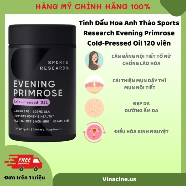 Sports Research Evening Primrose Oil là thực phẩm chức năng cung cấp tinh dầu hoa anh thảo ép lạnh, giàu axit gamma-linolenic (GLA) – dưỡng chất thiết yếu cho cơ thể, đặc biệt là phụ nữ. Sản phẩm hỗ trợ tối ưu sức khỏe sinh sản, làm đẹp da và tăng cường hệ miễn dịch.