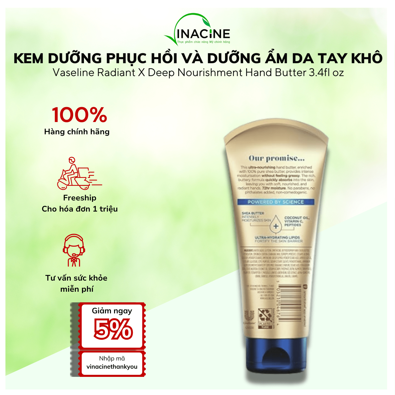 Thương Hiệu: VaselineKem Dưỡng Tay Chuyên Sâu, Phục Hồi Và Dưỡng Ẩm Da Tay Khô Vaseline Radiant X Deep Nourishment Hand Butter 3.4fl OZ