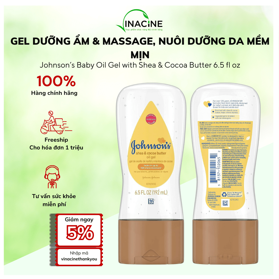 Johnson’s Baby Oil Gel with Shea & Cocoa Butter (6.5 fl oz) là gel dưỡng ẩm và massage toàn thân giúp khóa ẩm, nuôi dưỡng và làm mềm da một cách nhẹ nhàng. Công thức chứa dầu khoáng thiên nhiên, bơ hạt mỡ (Shea Butter) và bơ ca cao (Cocoa Butter) giúp giữ ẩm lâu dài, giảm khô ráp và mang lại làn da mềm mại, mịn màng như da em bé. Thích hợp cho trẻ sơ sinh, trẻ nhỏ và cả người lớn có làn da khô, nhạy cảm.