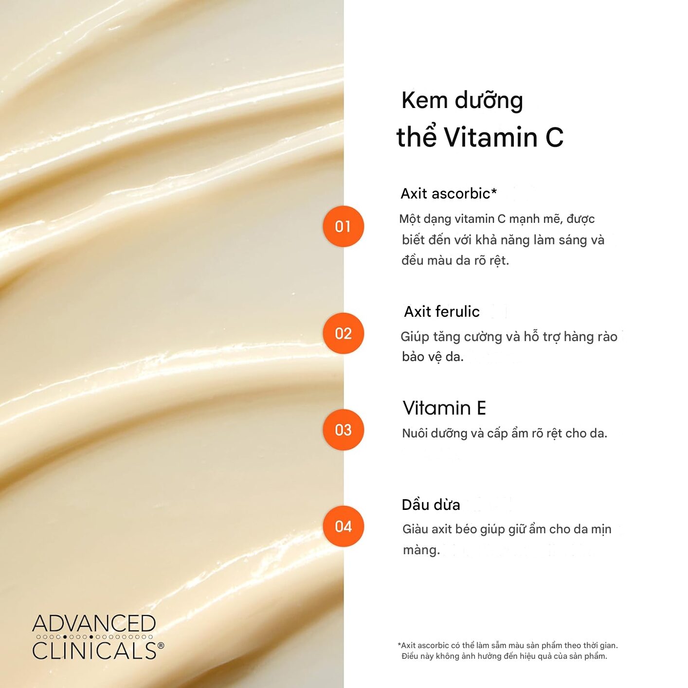 - Có thể dùng cho da mặt được không? → Sản phẩm được thiết kế tối ưu cho da body. Với da mặt, bạn nên ưu tiên các dòng Serum Vitamin C chuyên biệt của Advanced Clinicals để phù hợp với đặc tính da nhạy cảm hơn.