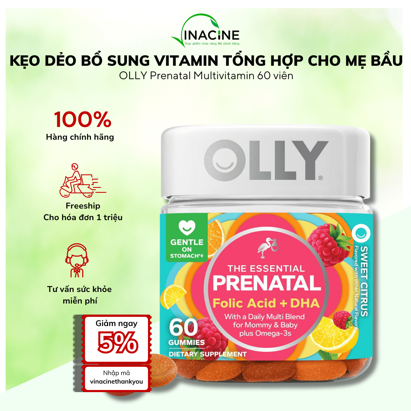 Để đảm bảo sản phẩm OLLY Prenatal Multivitamin Gummy luôn mới và có hạn sử dụng dài nhất. Vinacine chỉ nhập sản phẩm từ Mỹ về VN sau khi quý khách đặt hàng (thời gian nhận hàng trung bình từ 10-15 ngày, trong một số trường hợp có thể lên đến 20 ngày). Khi đặt hàng vui lòng để lại thông tin shop qua Zalo/Hotline: 0853.666.777