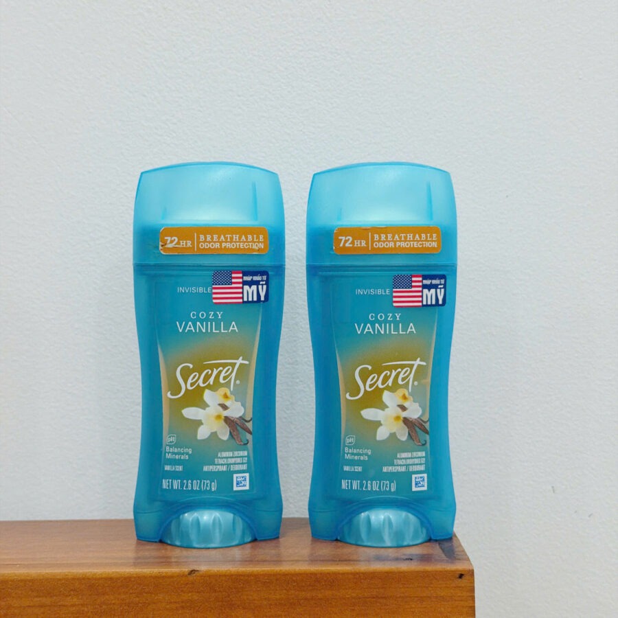 Secret là thương hiệu khử mùi và ngăn mồ hôi nổi tiếng đến từ Mỹ, trực thuộc tập đoàn P&G. Các sản phẩm của Secret được nghiên cứu dành riêng cho phụ nữ, giúp kiểm soát mồ hôi và mùi cơ thể hiệu quả trong khi vẫn dịu nhẹ, an toàn cho da khi sử dụng hằng ngày. Secret Fresh Antiperspirant Deodorant Cozy Vanilla 73g là lăn khử mùi dạng sáp kết hợp antiperspirant & deodorant, giúp giảm tiết mồ hôi và ngăn mùi cơ thể hiệu quả. Hương Cozy Vanilla mang cảm giác ấm áp, ngọt dịu và dễ chịu, không gắt, giúp bạn luôn tự tin và thư giãn suốt ngày dài.