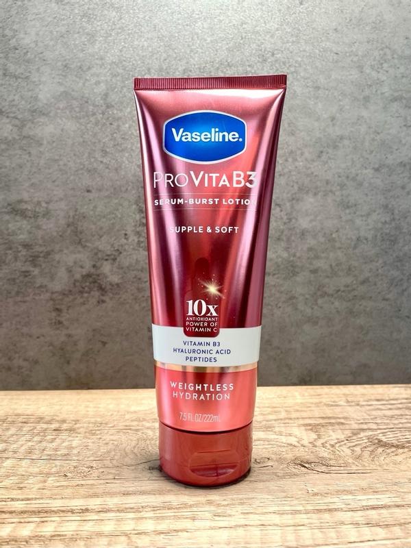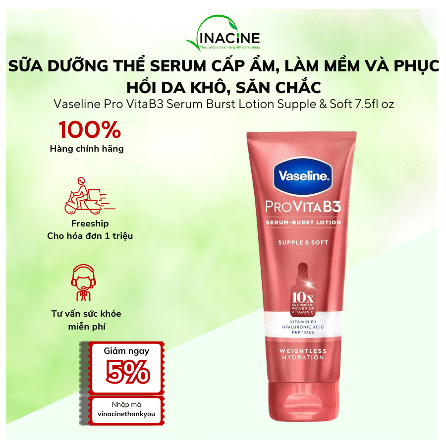Vaseline Pro VitaB3 Serum Burst Lotion Supple & Soft, 7.5 fl oz là sữa dưỡng thể dạng serum thế hệ mới giúp cấp ẩm chuyên sâu, phục hồi da khô và cải thiện độ đàn hồi, mang lại làn da mềm mại, ẩm mượt và tràn đầy sức sống.