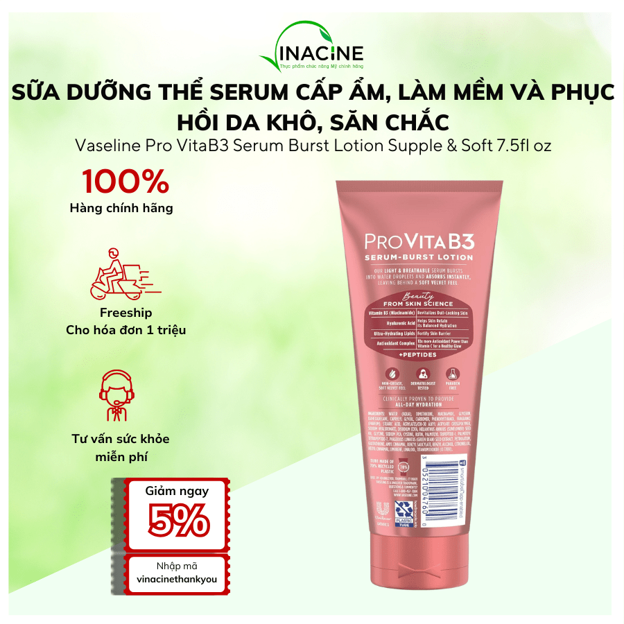 Sữa dưỡng thể serum cấp ẩm, làm mềm và phục hồi da khô, săn chắc Vaseline Pro VitaB3 Serum Burst Lotion Supple & Soft 7.5fl oz