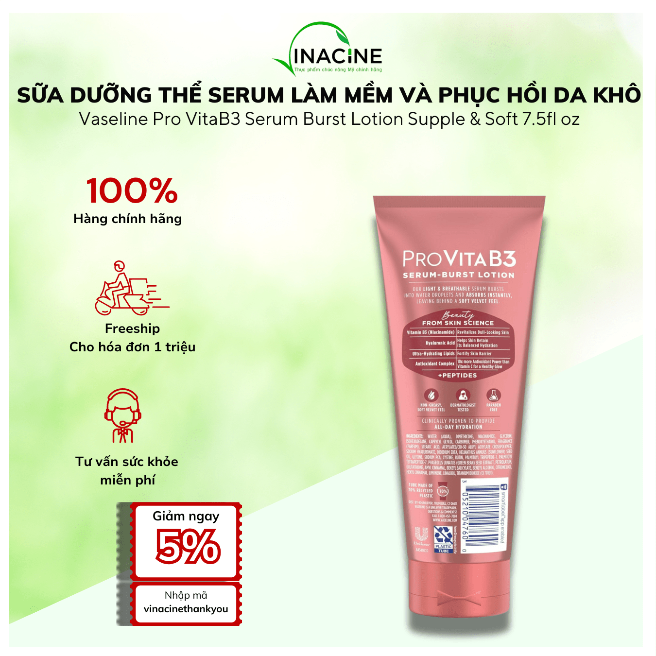Sữa dưỡng thể serum cấp ẩm, làm mềm và phục hồi da khô, săn chắc Vaseline Pro VitaB3 Serum Burst Lotion Supple & Soft 7.5fl oz