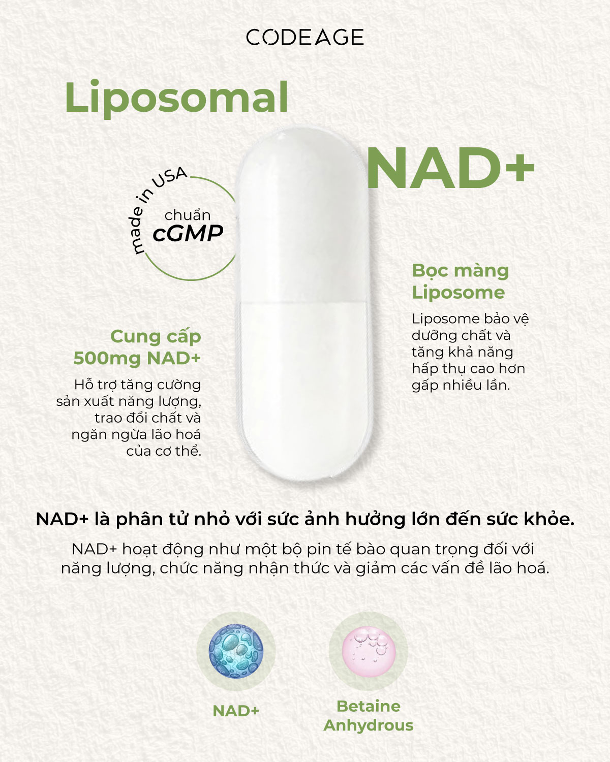 Codeage là thương hiệu thực phẩm bổ sung cao cấp từ Mỹ, luôn dẫn đầu trong việc áp dụng các công nghệ tiên tiến nhất để tối ưu hóa hiệu quả sản phẩm. Codeage Liposomal NMN Platinum là một trong những sản phẩm tiên phong trong lĩnh vực chống lão hóa, cung cấp NMN (Nicotinamide Mononucleotide) ở dạng Liposome. Sản phẩm được thiết kế để trực tiếp kích hoạt gen trường thọ Sirtuins, từ đó trẻ hóa tế bào và hỗ trợ phục hồi sức khỏe tổng thể.