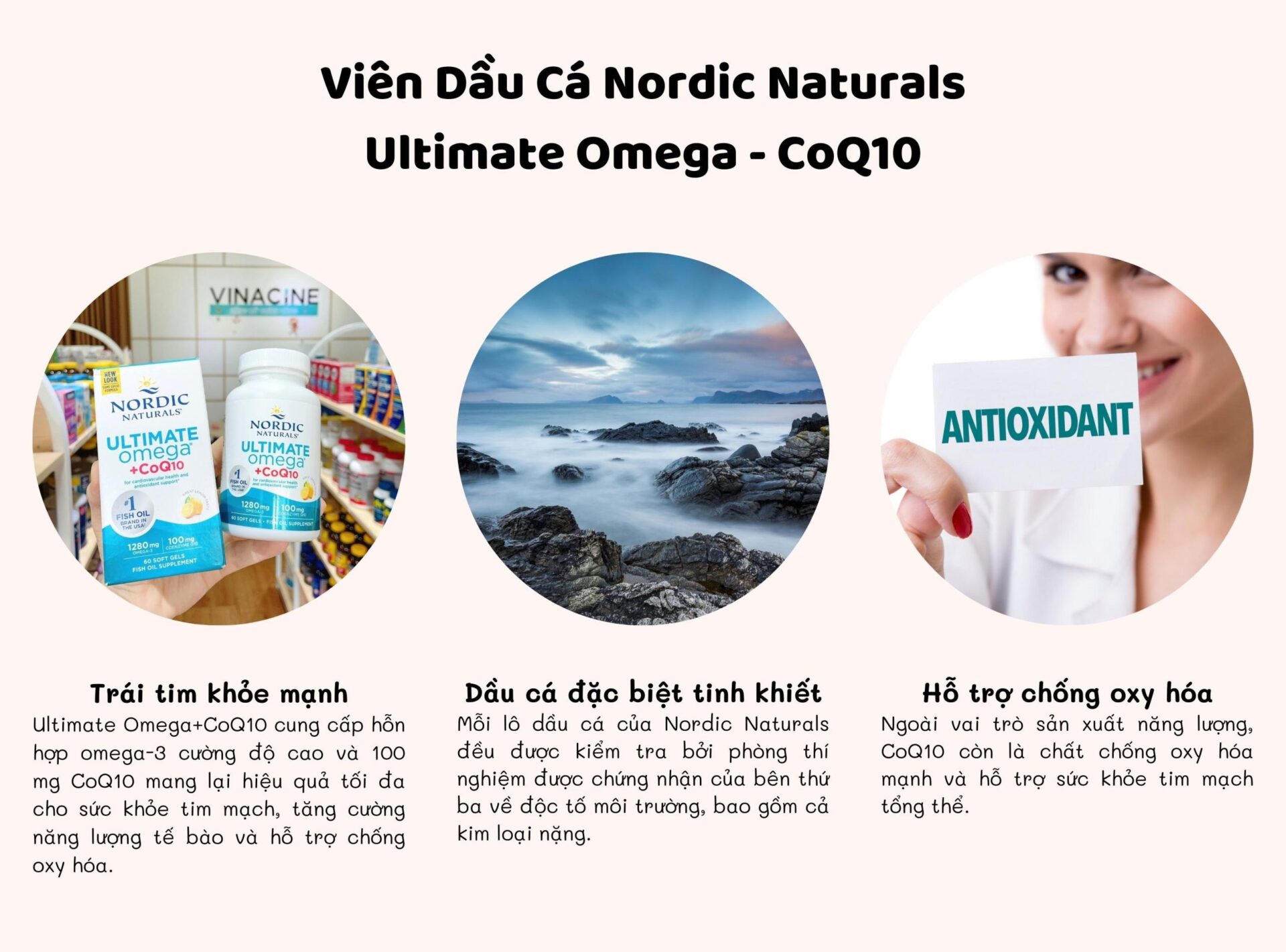 Viên Uống Dầu Cá Nordic Naturals Ultimate Omega – CoQ10 cung cấp hỗn hợp omega-3 hàm lượng cao và 100 mg CoQ10. Mang lại hiệu quả tối đa cho sức khỏe tim mạch, tăng cường năng lượng tế bào và hỗ trợ chống oxy hóa. Đây sẽ là sự lựa chọn hoàn hảo cho những người muốn tăng cường sức khỏe tổng thể và giảm nguy cơ bệnh lý tim mạch.