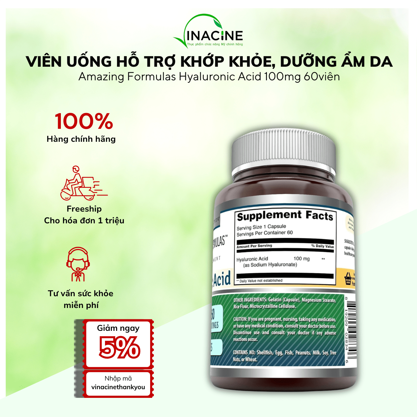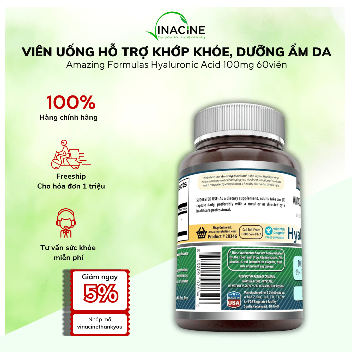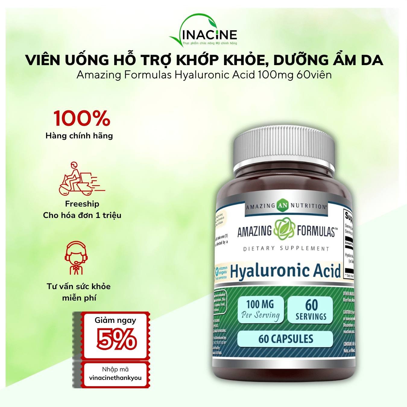 Viên Uống Hỗ Trợ Khớp Khỏe, Dưỡng Ẩm Da Từ Bên Trong Amazing Formulas Hyaluronic Acid 100mg 60viên