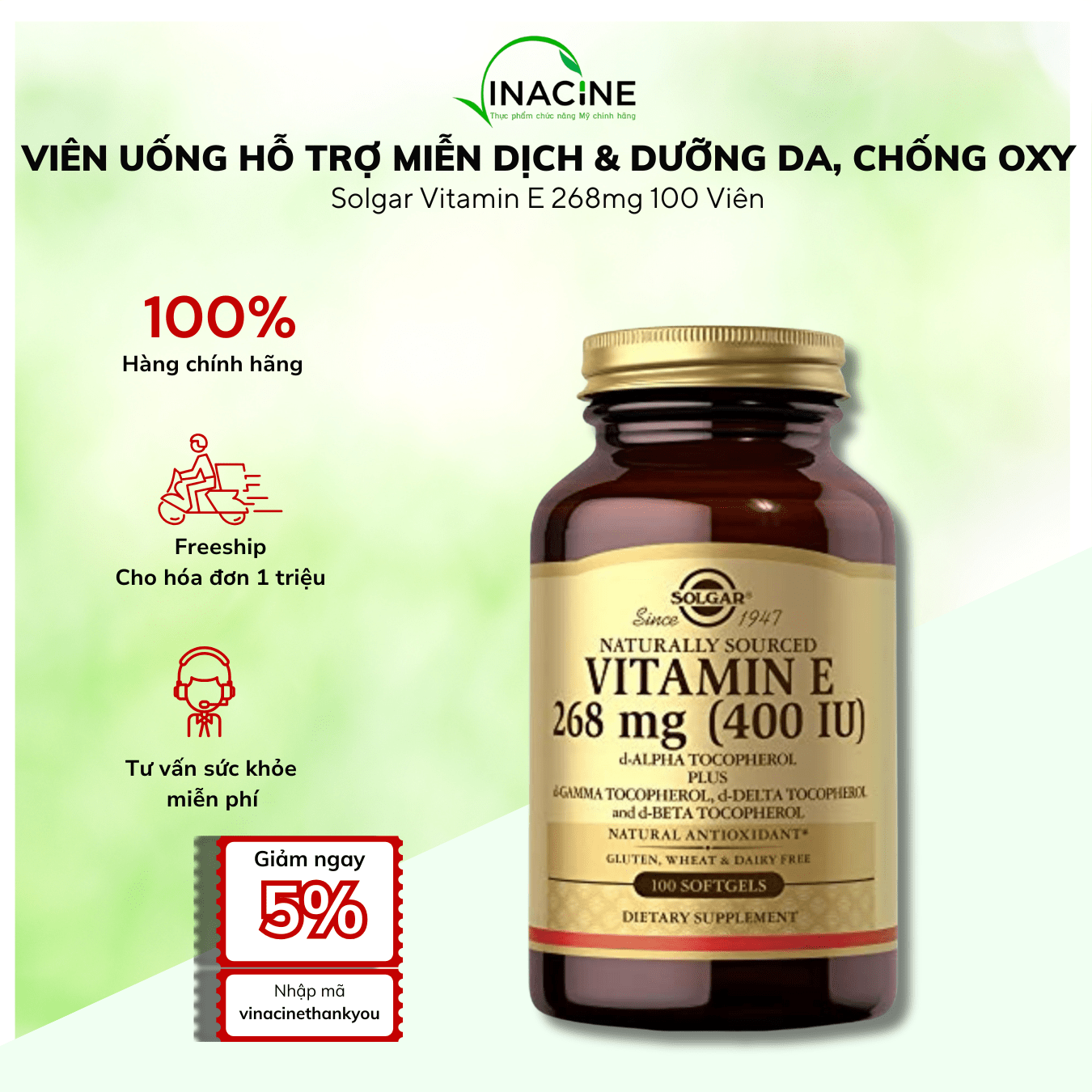 Solgar Vitamin E 268mg (400 IU) – Hỗ Trợ Miễn Dịch & Dưỡng Da, Chống Oxy Hóa Tự Nhiên