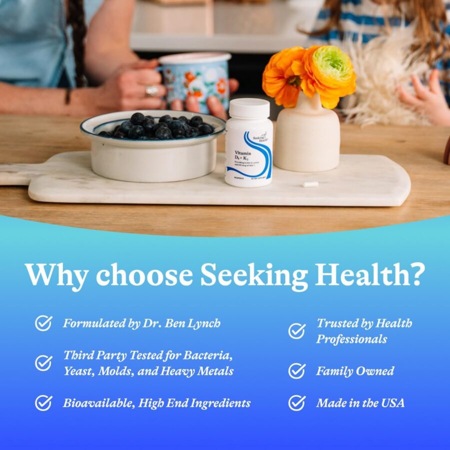 Seeking Health là một thương hiệu thực phẩm bổ sung uy tín đến từ Mỹ. Hãng cam kết tạo ra các sản phẩm chất lượng cao, tinh khiết. Vitamin D3 + K2 là sản phẩm kết hợp giữa Vitamin D3 và Vitamin K2 trong một công thức mạnh mẽ. D3 giúp cơ thể hấp thu canxi từ ruột, còn K2 có nhiệm vụ hướng dẫn canxi đã hấp thu vào xương và răng.
