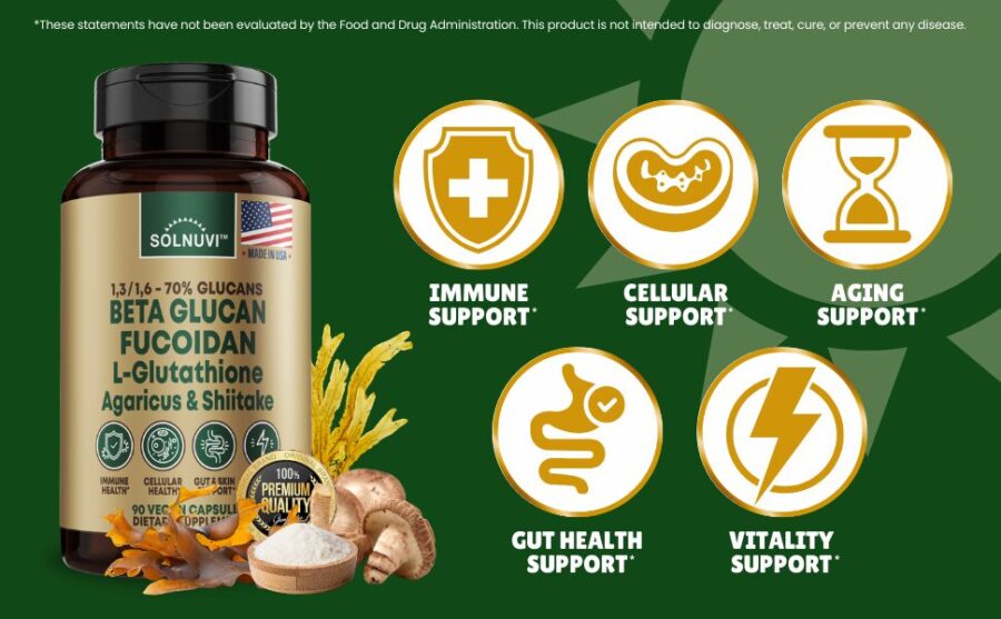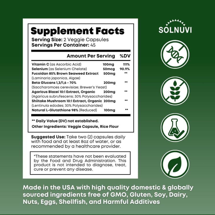 SOLNUVI là thương hiệu chuyên biệt, cam kết mang lại các công thức kết hợp dựa trên khoa học, tối ưu hóa khả năng miễn dịch và sức khỏe tế bào. Beta Glucan & Fucoidan Brown Seaweed Extract – L Glutathione kết hợp ba hoạt chất hàng đầu đã được nghiên cứu khoa học, cung cấp giải pháp hỗ trợ miễn dịch toàn diện và giải độc tế bào. Được thiết kế để tạo ra một lá chắn kép (tăng cường miễn dịch và giải độc tế bào), lý tưởng cho những người đang tìm kiếm sự hỗ trợ toàn diện nhất cho cơ thể.