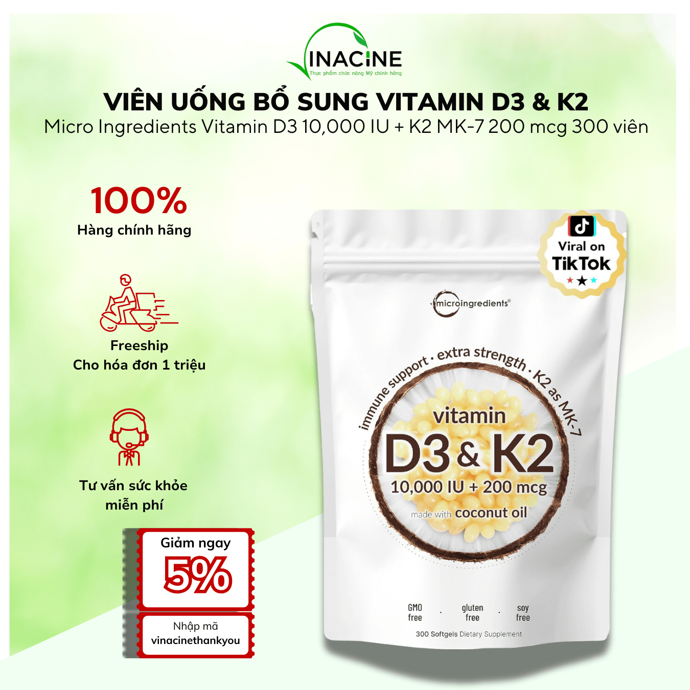 Viên Uống Hỗ Trợ Sức Khỏe Tổng Thể Micro Ingredients Vitamin D3 10,000 IU + K2 MK-7 200 mcg 300 viên