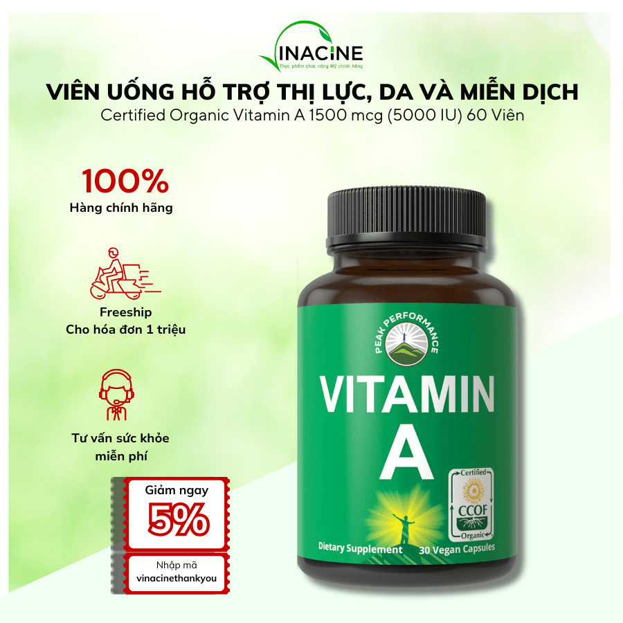 Để đảm bảo sản phẩm Certified Organic Vitamin A 5000 IU luôn mới và có hạn sử dụng dài nhất. Vinacine chỉ nhập sản phẩm từ Mỹ về VN sau khi quý khách đặt hàng (thời gian nhận hàng trung bình từ 10-15 ngày, trong một số trường hợp có thể lên đến 20 ngày). Khi đặt hàng vui lòng để lại thông tin shop qua Zalo/Hotline: 0853.666.777