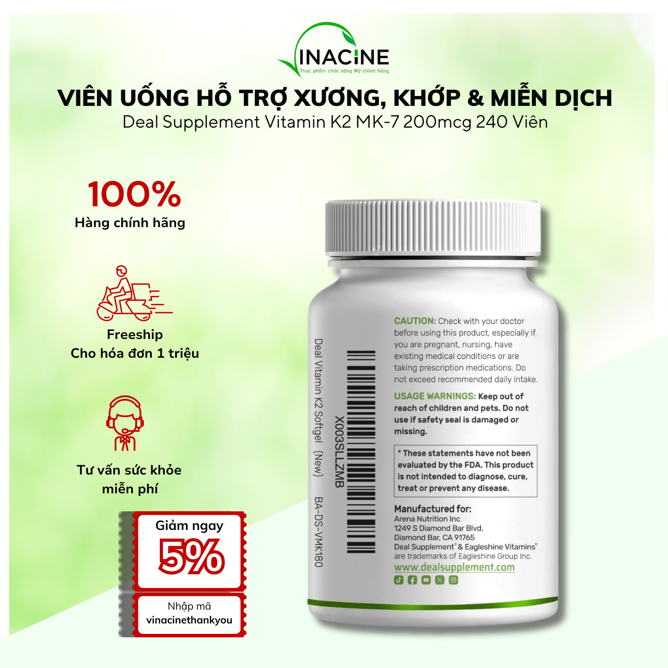 Để đảm bảo sản phẩm Deal Supplement Vitamin K2 MK-7 200mcg luôn mới và có hạn sử dụng dài nhất. Vinacine chỉ nhập sản phẩm từ Mỹ về VN sau khi quý khách đặt hàng (thời gian nhận hàng trung bình từ 10-15 ngày, trong một số trường hợp có thể lên đến 20 ngày). Khi đặt hàng vui lòng để lại thông tin shop qua Zalo/Hotline: 0853.666.777