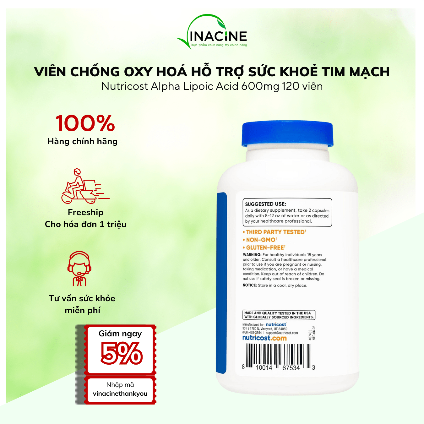 Thương Hiệu: NutricostViên đặt trị viêm nhấm ngứa phụ khoa Nutricost Boric Acid 600mg 30 viên 290,000 ₫