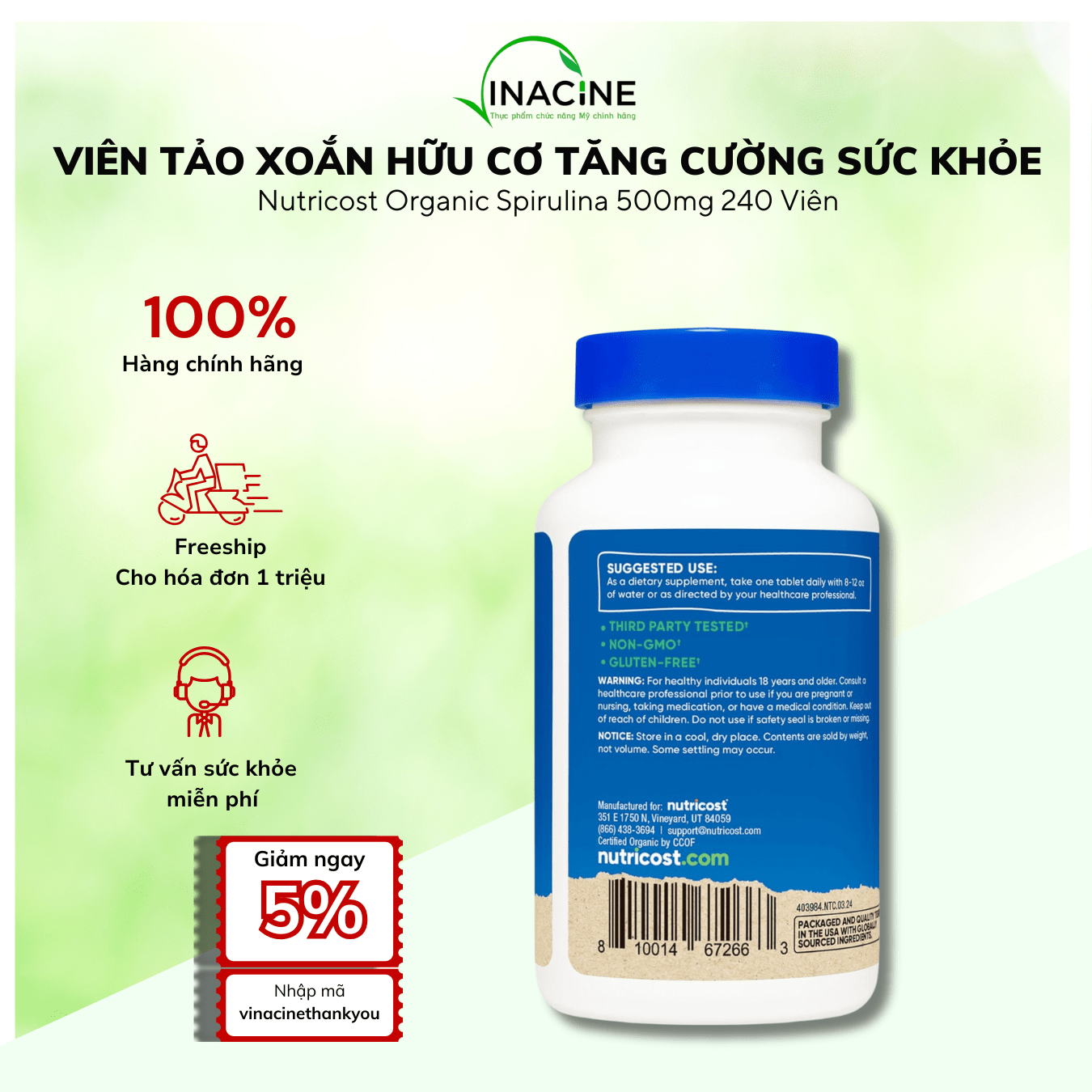 Thương Hiệu: NutricostViên Uống Bổ Sung Tảo Hữu Cơ Nutricost Chlorella 500mg 240 viên