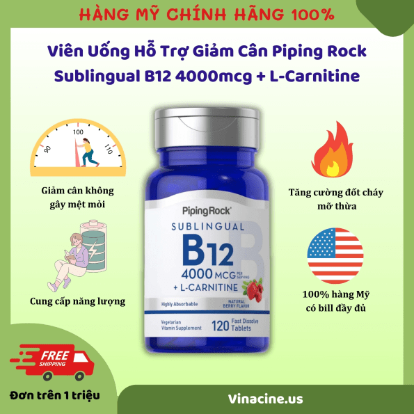 Viên Uống Hỗ Trợ Giảm Cân Piping Rock Sublingual B12 4000mcg + L-Carnitine – Vinacine