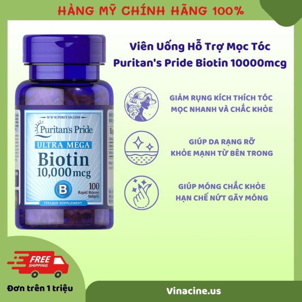 Viên Uống Hỗ Trợ Mọc Tóc Puritan’s Pride Biotin 10000mcg – Vinacine: à sản phẩm của công ty Puritan’s Pride, Mỹ. Sản phẩm cung cấp hàm lượng biotin cao, giúp hỗ trợ mọc tóc, ngăn ngừa rụng tóc, giúp tóc chắc khỏe, óng mượt.
