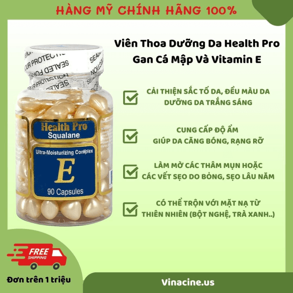 Viên Thoa Dưỡng Da Health Pro Squalane Gan Cá Mập Và Vitamin E 90 viên – Vinacine: là sản phẩm của công ty Nu Health. Sản phẩm được bào chế từ các thành phần tự nhiên, giúp dưỡng ẩm, làm mềm da, giảm thâm nám, tàn nhang.